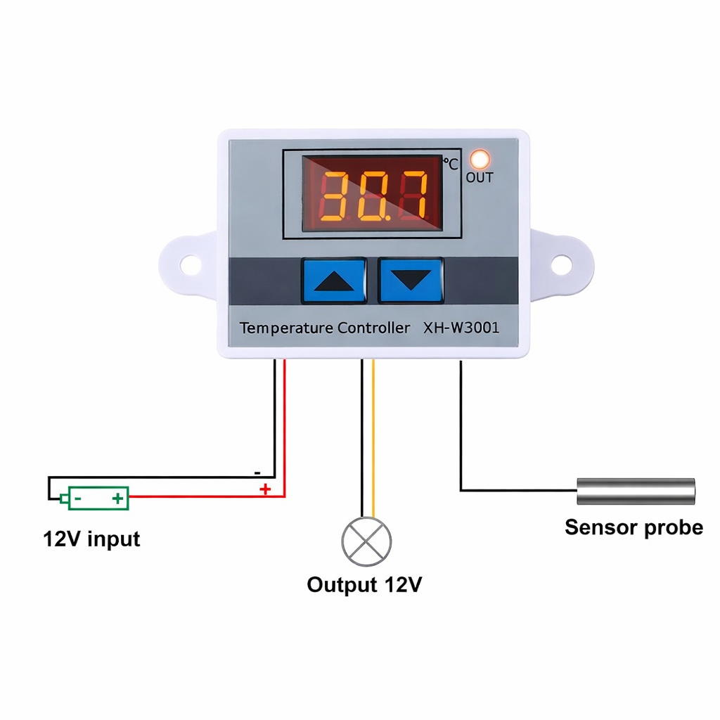 XH-W3001 — терморегулятор високої точності, від відомого Китайського виробника XH-Electron Co, Ltd, живлення 12 В постійного струму (від автомобільної АКБ), обладнаний виносним вологонепроникним датчиком для автоматичного підтримання заданої температури та має цифровий LED-дисплей для зручного перегляду інформації та настроювання температурного режиму.